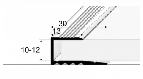 Ukončovací profil o tloušťce materiálu 10 - 12 mm pro zasunutí podlahové krytiny. Je opatřen na nášlapné straně protiskluzovými drážkami.